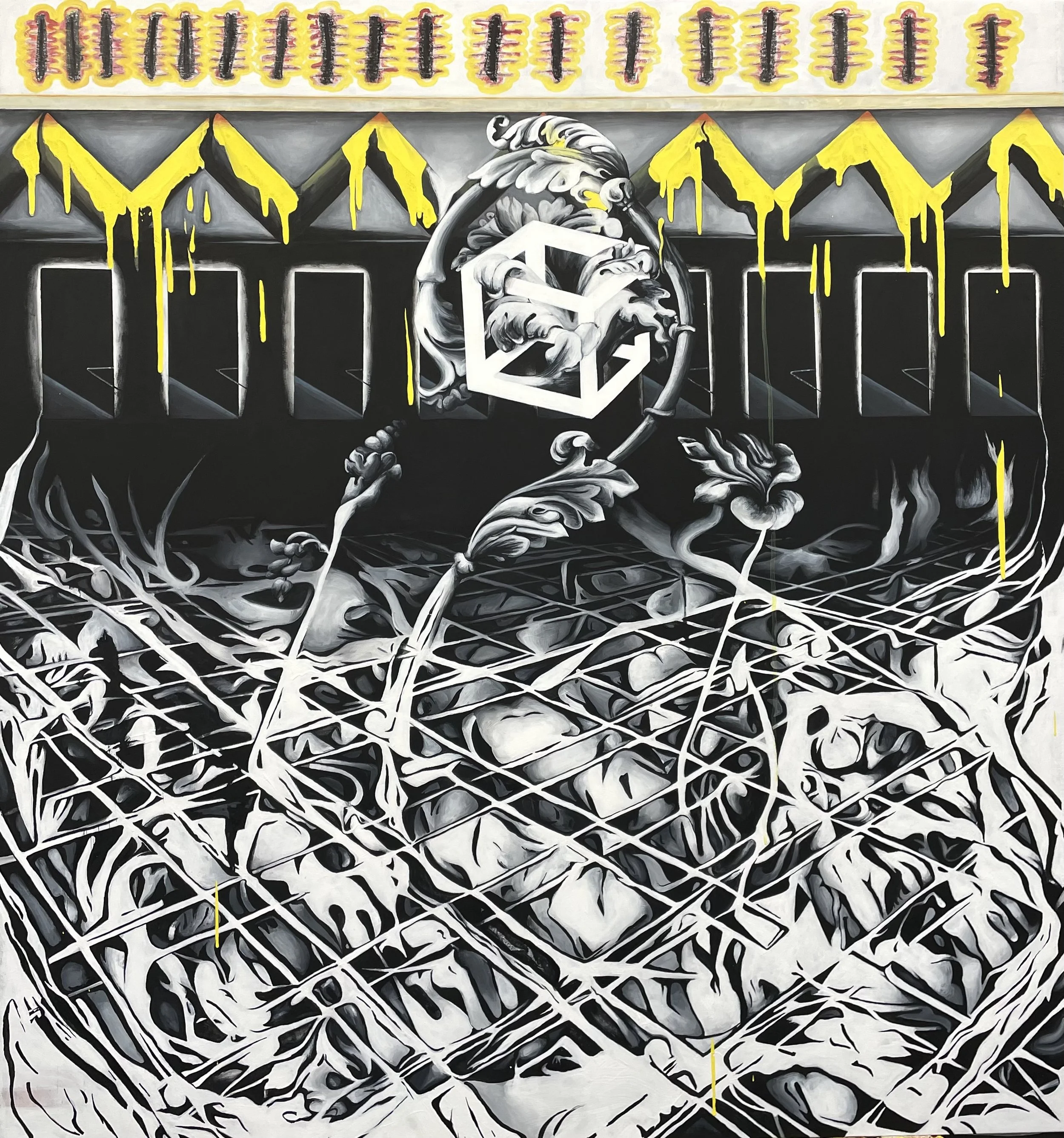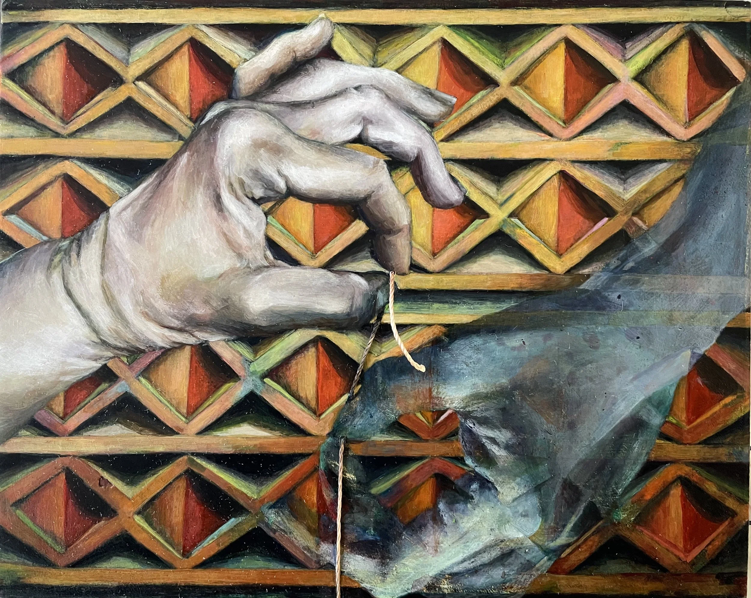 Momania, 2023. Oil on canvas, nylon fibers -- 12x12x2 in.